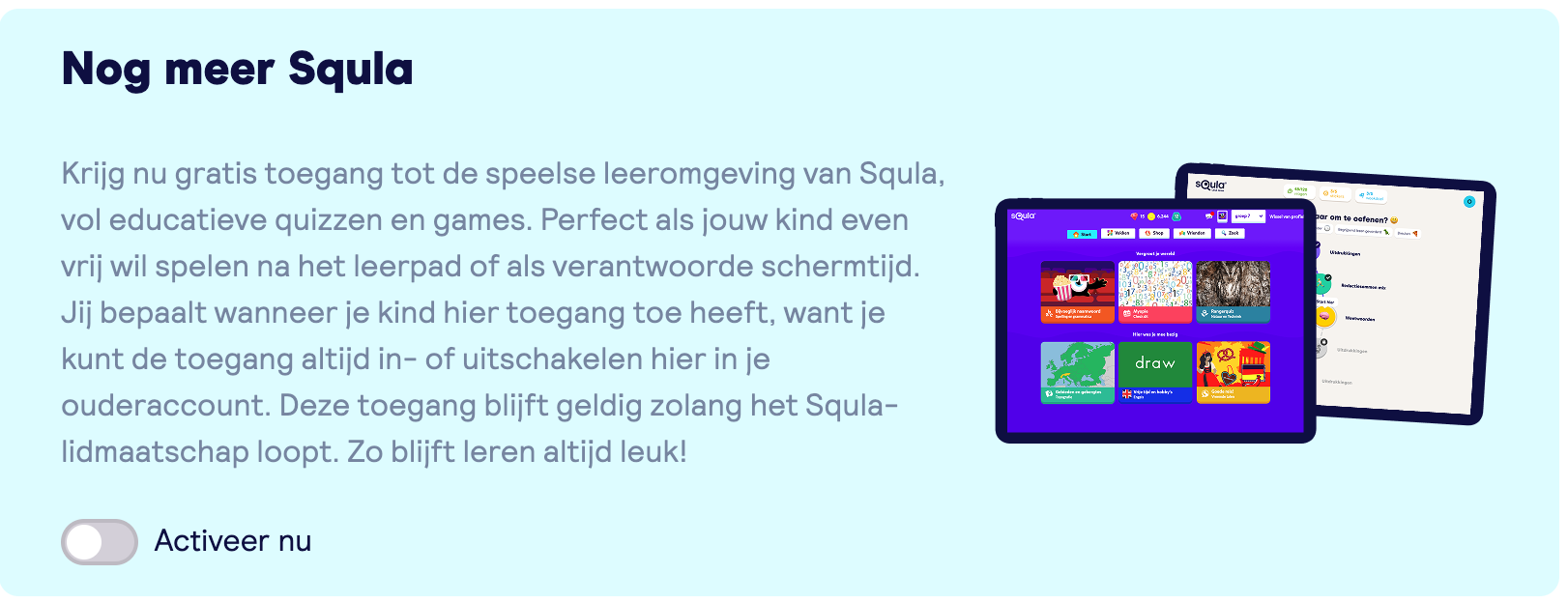 Je kunt via het ouderaccount de speelse Squla-omgeving met extra vakken zoals Engels en Topografie activeren voor je kind.